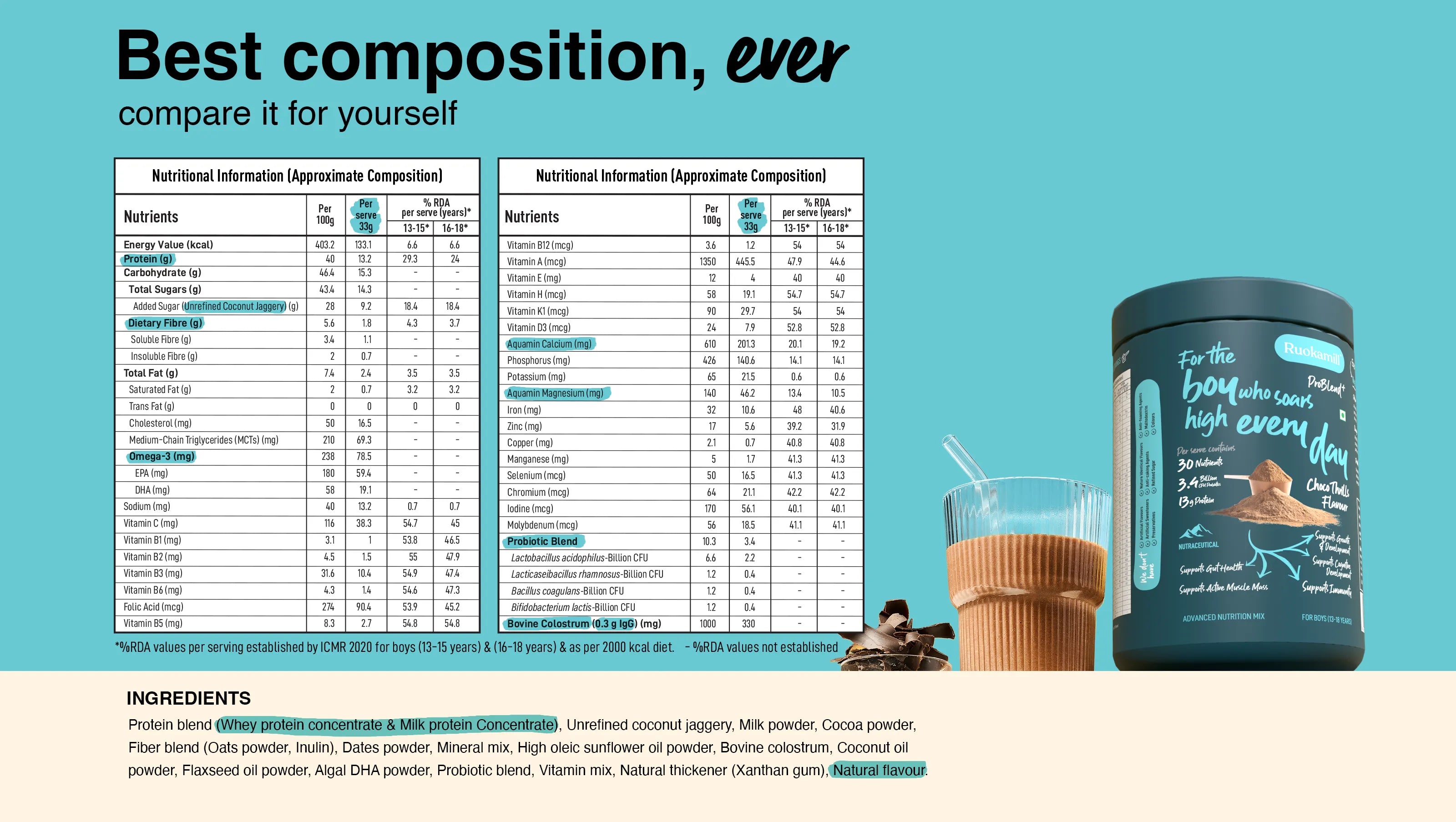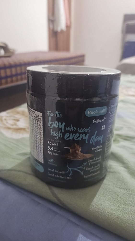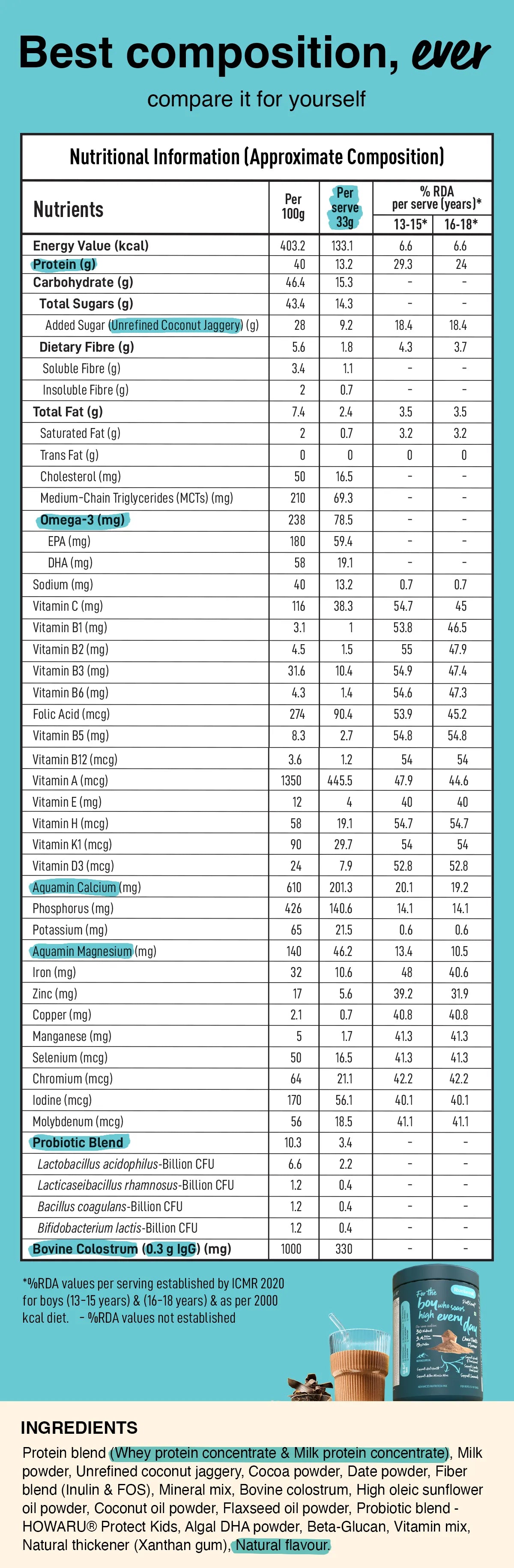 Ruokamill ProBlend⁺ for Boys (13–18 years) is a premium High-Protein, All-in-One nutrition powder for teenage boys, tailored to support rapid growth, muscle development, and higher energy demands during adolescence. Each scoop delivers 13.2g of complete protein and 30 essential vitamins and minerals, plus Aquamin Calcium, Magnesium, and B-vitamins to fuel stamina, sports performance, and recovery. With colostrum, probiotics, and prebiotics, it strengthens immunity and digestion. Omega-3 (DHA & EPA) supports focus and brain health. Naturally sweetened with dates and coconut jaggery, it’s balanced, safe, and refined sugar–free.
