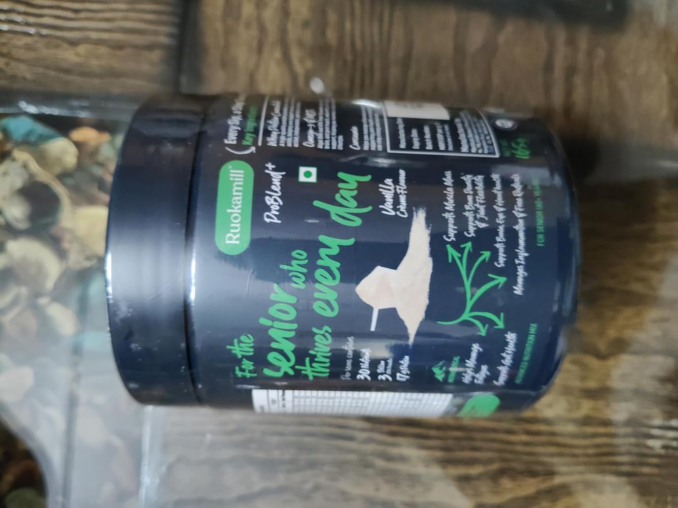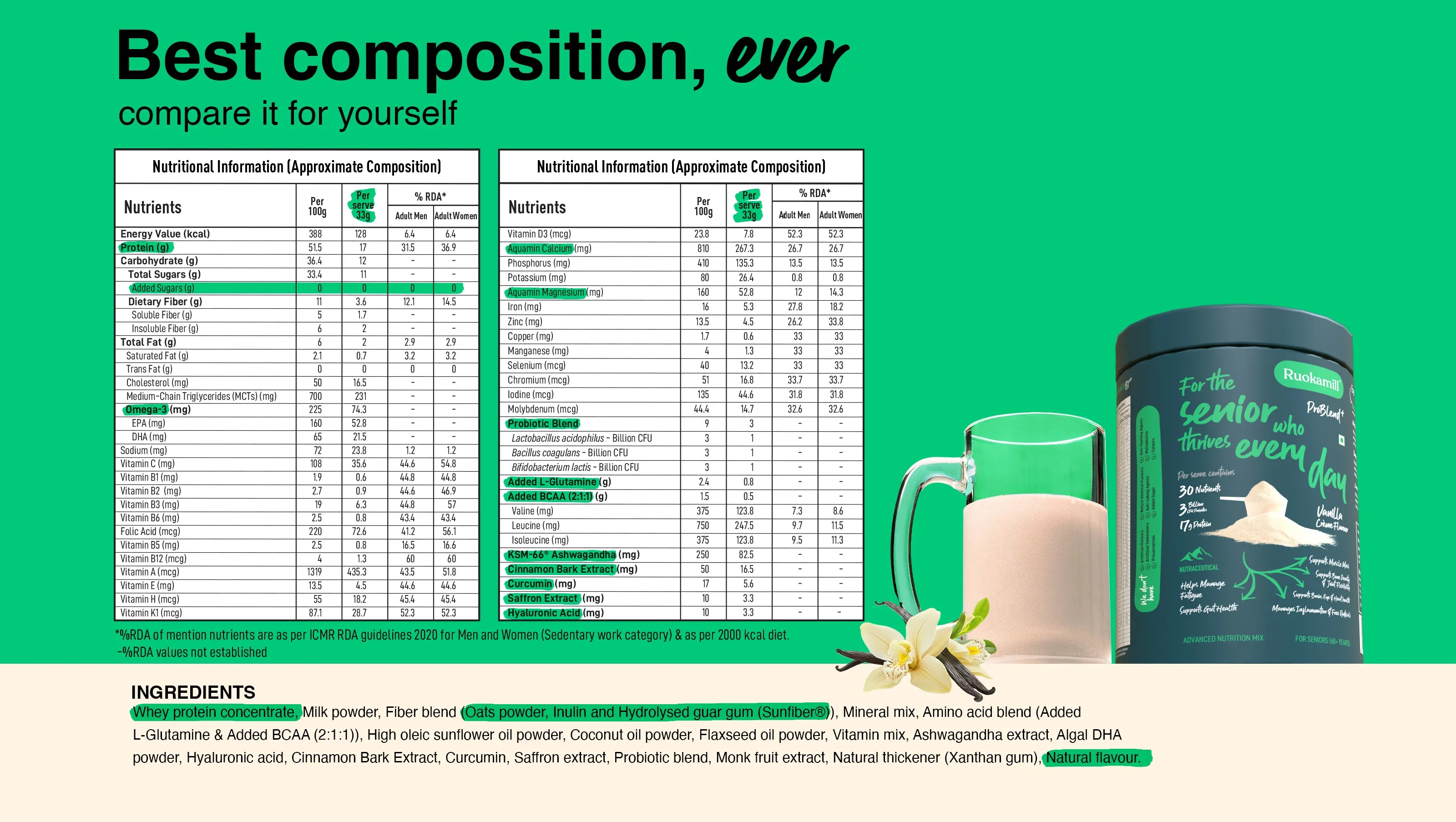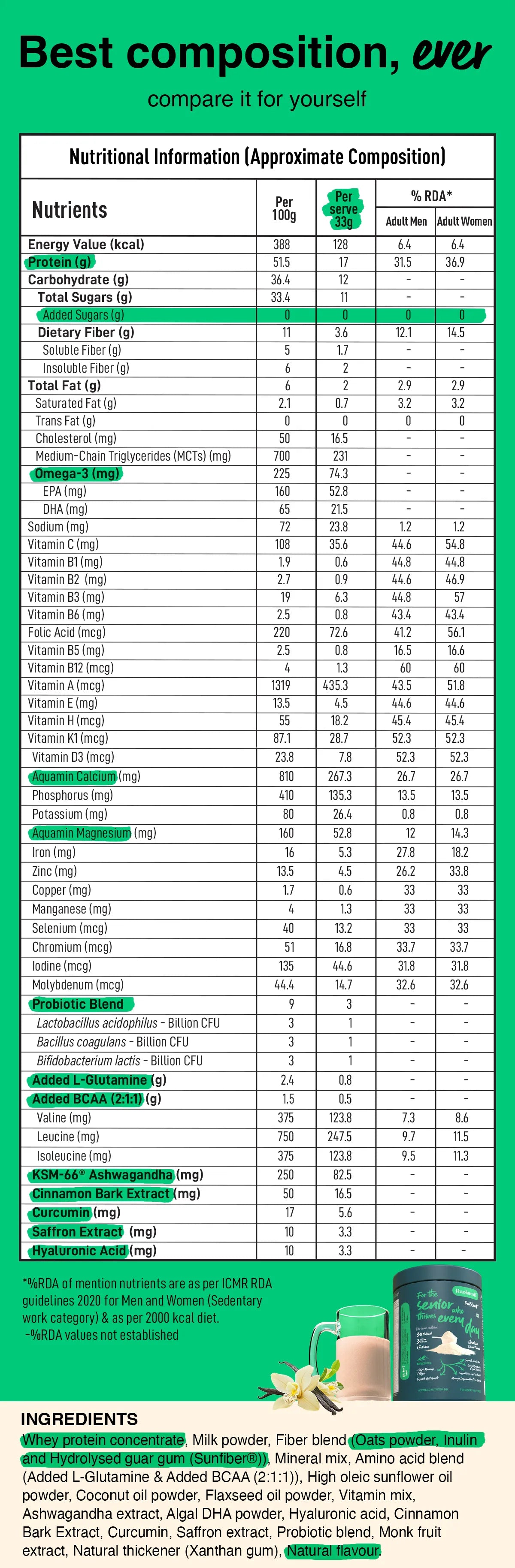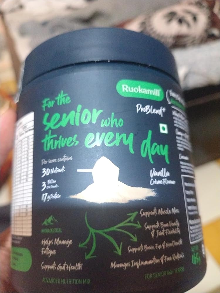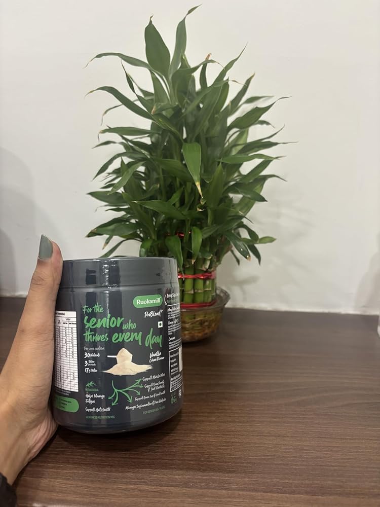 Ruokamill ProBlend⁺ for elderly is a High Protein, All-in-One nutrition mix tailored specific to their needs. Each serving provides 17g of protein, primarily from whey protein concentrate. It has 30 essential nutrients, BCAAs, and L-Glutamine to preserve strength and mobility. Fortified with Hyaluronic Acid, White Curcumin, Saffron Extract, Omega-3s, and Aquamin® calcium and magnesium, it supports joint health, cognitive health, immunity, and heart wellness. Gentle on the gut, diabetic-friendly, and with zero added sugar, it delivers balanced nutrition for healthy, active aging.